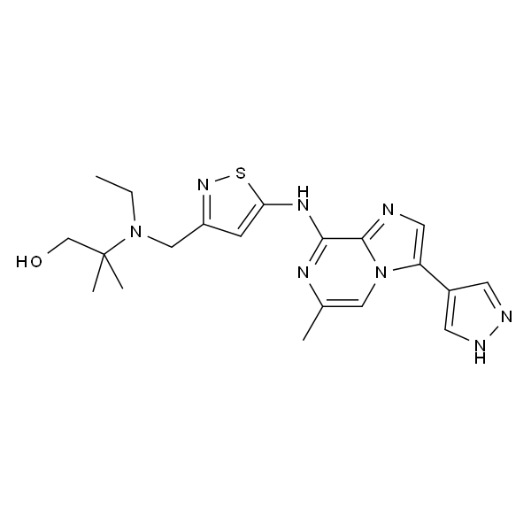 InChI=1S/C20H26N8OS/c1-5-27(20(3,4)12-29)11-15-6-17(30-26-15)25-18-19-21-9-16(14-7-22-23-8-14)28(19)10-13(2)24-18/h6-10,29H,5,11-12H2,1-4H3,(H,22,23)(H,24,25)
