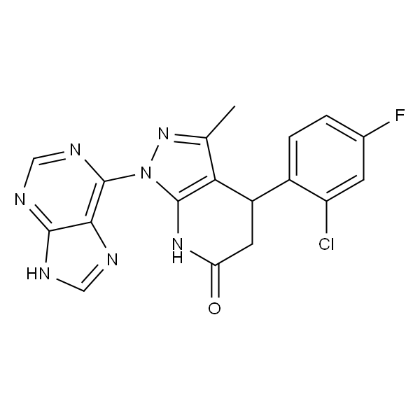 InChI=1S/C18H13ClFN7O/c1-8-14-11(10-3-2-9(20)4-12(10)19)5-13(28)25-17(14)27(26-8)18-15-16(22-6-21-15)23-7-24-18/h2-4,6-7,11H,5H2,1H3,(H,25,28)(H,21,22,23,24)