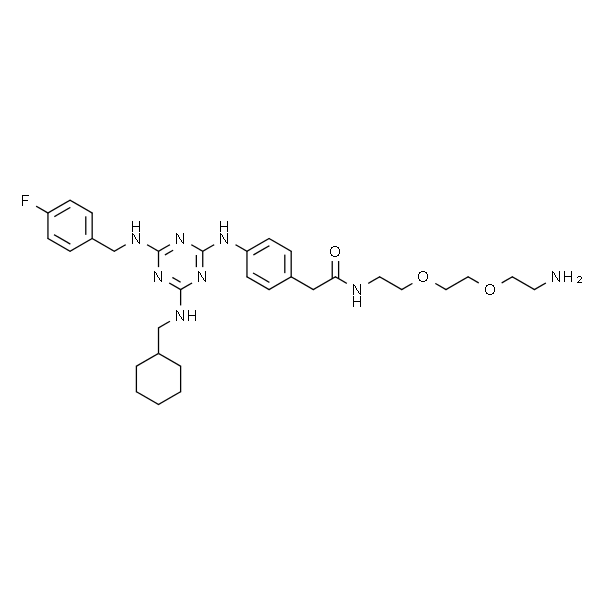 InChI=1S/C31H43FN8O3/c32-26-10-6-25(7-11-26)22-36-30-38-29(35-21-24-4-2-1-3-5-24)39-31(40-30)37-27-12-8-23(9-13-27)20-28(41)34-15-17-43-19-18-42-16-14-33/h6-13,24H,1-5,14-22,33H2,(H,34,41)(H3,35,36,37,38,39,40)