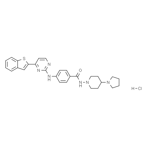 InChI=1S/C28H29N5OS.ClH/c34-27(33-17-12-23(13-18-33)32-15-3-4-16-32)20-7-9-22(10-8-20)30-28-29-14-11-24(31-28)26-19-21-5-1-2-6-25(21)35-26;/h1-2,5-11,14,19,23H,3-4,12-13,15-18H2,(H,29,30,31);1H