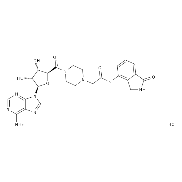 InChI=1S/C24H27N9O6.2ClH/c25-20-16-21(28-10-27-20)33(11-29-16)24-18(36)17(35)19(39-24)23(38)32-6-4-31(5-7-32)9-15(34)30-14-3-1-2-12-13(14)8-26-22(12)37;;/h1-3,10-11,17-19,24,35-36H,4-9H2,(H,26,37)(H,30,34)(H2,25,27,28);2*1H/t17-,18?,19+,24-;;/m1../s1