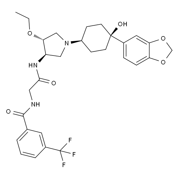 InChI=1S/C29H34F3N3O6/c1-2-39-25-16-35(21-8-10-28(38,11-9-21)19-6-7-23-24(13-19)41-17-40-23)15-22(25)34-26(36)14-33-27(37)18-4-3-5-20(12-18)29(30,31)32/h3-7,12-13,21-22,25,38H,2,8-11,14-17H2,1H3,(H,33,37)(H,34,36)/t21?,22-,25-,28?/m0/s1