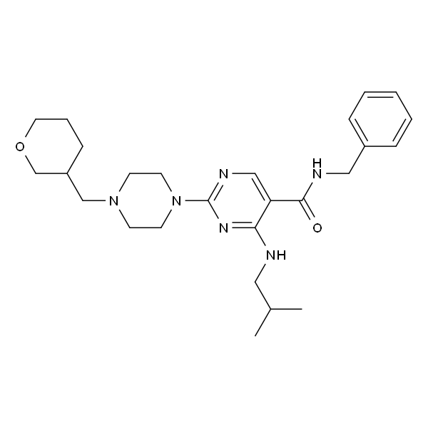InChI=1S/C26H38N6O2/c1-20(2)15-27-24-23(25(33)28-16-21-7-4-3-5-8-21)17-29-26(30-24)32-12-10-31(11-13-32)18-22-9-6-14-34-19-22/h3-5,7-8,17,20,22H,6,9-16,18-19H2,1-2H3,(H,28,33)(H,27,29,30)
