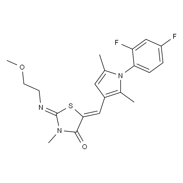 InChI=1S/C20H21F2N3O2S/c1-12-9-14(13(2)25(12)17-6-5-15(21)11-16(17)22)10-18-19(26)24(3)20(28-18)23-7-8-27-4/h5-6,9-11H,7-8H2,1-4H3/b18-10-,23-20?