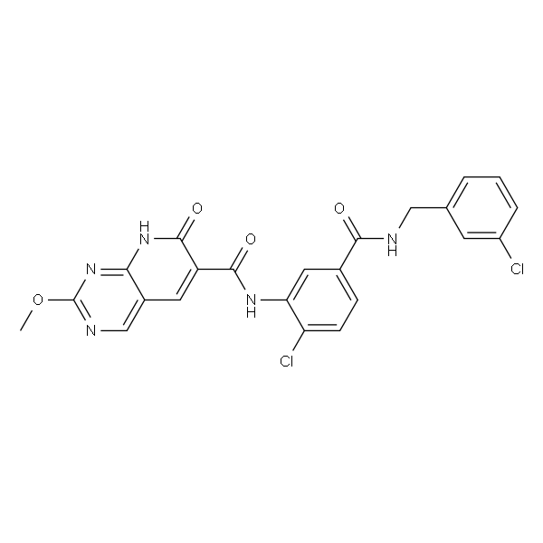 InChI=1S/C23H17Cl2N5O4/c1-34-23-27-11-14-8-16(22(33)29-19(14)30-23)21(32)28-18-9-13(5-6-17(18)25)20(31)26-10-12-3-2-4-15(24)7-12/h2-9,11H,10H2,1H3,(H,26,31)(H,28,32)(H,27,29,30,33)