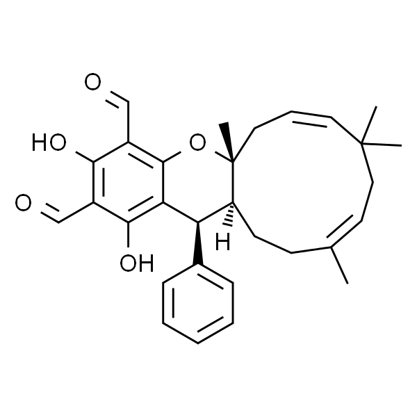 InChI=1S/C30H34O5/c1-19-11-12-23-24(20-9-6-5-7-10-20)25-27(34)21(17-31)26(33)22(18-32)28(25)35-30(23,4)15-8-14-29(2,3)16-13-19/h5-10,13-14,17-18,23-24,33-34H,11-12,15-16H2,1-4H3/b14-8-,19-13-/t23-,24+,30+/m1/s1