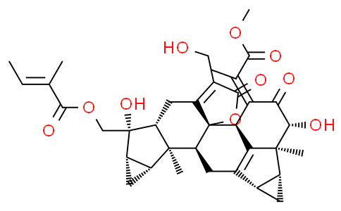 InChI=1S/C36H42O10/c1-7-14(2)30(40)45-13-35(43)22-10-21(22)33(4)23(35)11-20-18(12-37)32(42)46-36(20)24(33)9-17-16-8-19(16)34(5)26(17)27(36)25(28(38)29(34)39)15(3)31(41)44-6/h7,16,19,21-24,27,29,37,39,43H,8-13H2,1-6H3/b14-7+,25-15-/t16-,19-,21-,22+,23-,24+,27+,29+,33+,34+,35+,36+/m1/s1