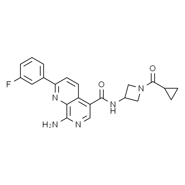 InChI=1S/C22H20FN5O2/c23-14-3-1-2-13(8-14)18-7-6-16-17(9-25-20(24)19(16)27-18)21(29)26-15-10-28(11-15)22(30)12-4-5-12/h1-3,6-9,12,15H,4-5,10-11H2,(H2,24,25)(H,26,29)