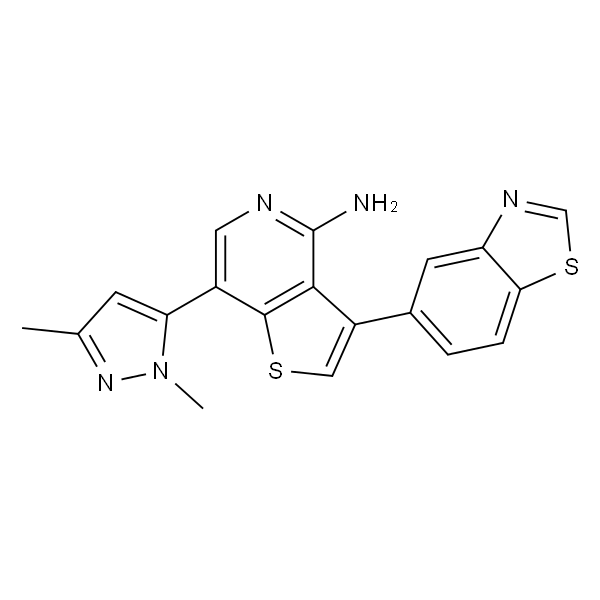 InChI=1S/C19H15N5S2/c1-10-5-15(24(2)23-10)12-7-21-19(20)17-13(8-25-18(12)17)11-3-4-16-14(6-11)22-9-26-16/h3-9H,1-2H3,(H2,20,21)