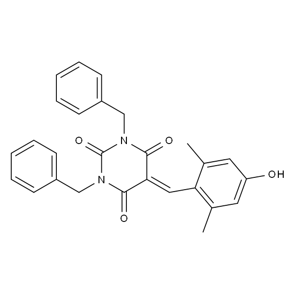 InChI=1S/C27H24N2O4/c1-18-13-22(30)14-19(2)23(18)15-24-25(31)28(16-20-9-5-3-6-10-20)27(33)29(26(24)32)17-21-11-7-4-8-12-21/h3-15,30H,16-17H2,1-2H3