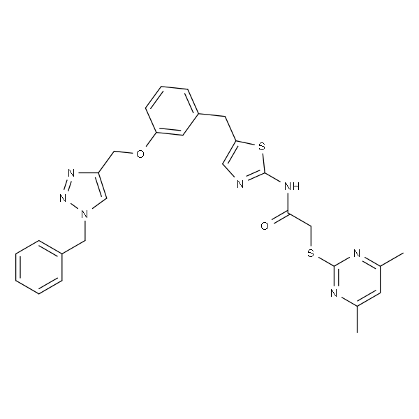 InChI=1S/C28H27N7O2S2/c1-19-11-20(2)31-28(30-19)38-18-26(36)32-27-29-14-25(39-27)13-22-9-6-10-24(12-22)37-17-23-16-35(34-33-23)15-21-7-4-3-5-8-21/h3-12,14,16H,13,15,17-18H2,1-2H3,(H,29,32,36)