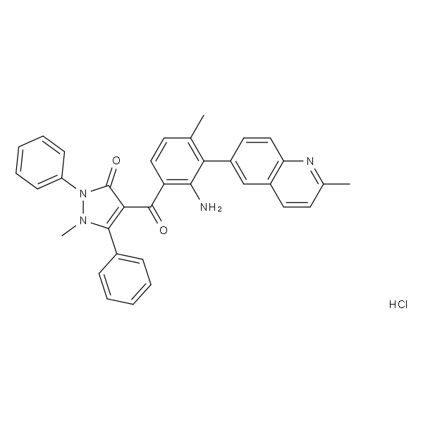 InChI=1S/C34H28N4O2.ClH/c1-21-14-18-27(31(35)29(21)25-17-19-28-24(20-25)16-15-22(2)36-28)33(39)30-32(23-10-6-4-7-11-23)37(3)38(34(30)40)26-12-8-5-9-13-26;/h4-20H,35H2,1-3H3;1H