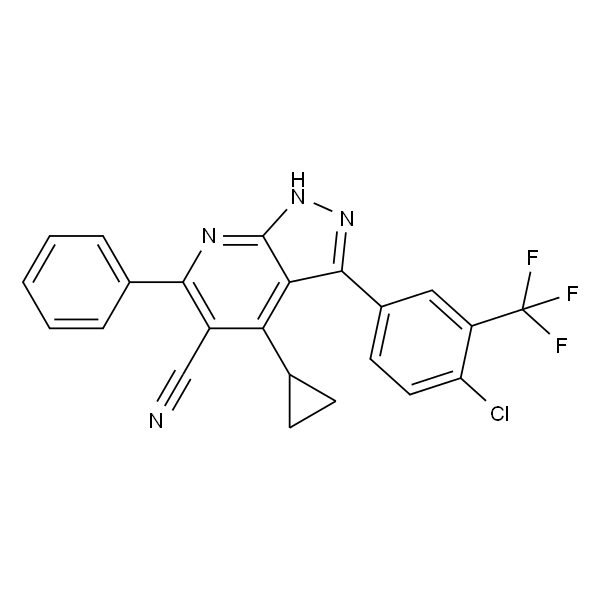 InChI=1S/C23H14ClF3N4/c24-17-9-8-14(10-16(17)23(25,26)27)21-19-18(12-6-7-12)15(11-28)20(29-22(19)31-30-21)13-4-2-1-3-5-13/h1-5,8-10,12H,6-7H2,(H,29,30,31)