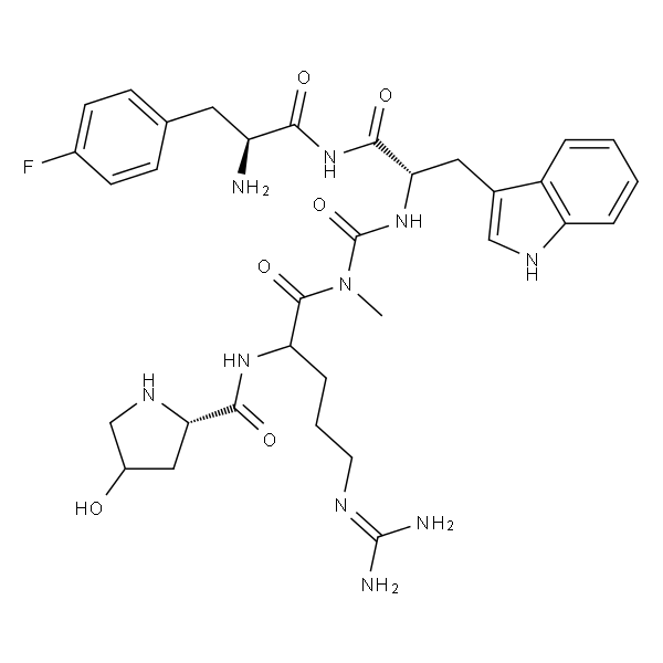 InChI=1S/C33H43FN10O6.2C2HF3O2/c34-20-9-7-18(8-10-20)12-23(35)32(50)44-17-21(45)14-27(44)31(49)43-25(6-3-11-39-33(37)38)30(48)41-16-28(46)42-26(29(36)47)13-19-15-40-24-5-2-1-4-22(19)24;2*3-2(4,5)1(6)7/h1-2,4-5,7-10,15,21,23,25-27,40,45H,3,6,11-14,16-17,35H2,(H2,36,47)(H,41,48)(H,42,46)(H,43,49)(H4,37,38,39);2*(H,6,7)/t21-,23+,25+,26+,27+;;/m1../s1