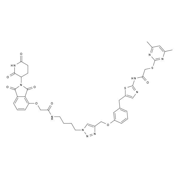 InChI=1S/C40H40N10O8S2/c1-23-15-24(2)44-40(43-23)59-22-34(53)46-39-42-18-28(60-39)17-25-7-5-8-27(16-25)57-20-26-19-49(48-47-26)14-4-3-13-41-33(52)21-58-31-10-6-9-29-35(31)38(56)50(37(29)55)30-11-12-32(51)45-36(30)54/h5-10,15-16,18-19,30H,3-4,11-14,17,20-22H2,1-2H3,(H,41,52)(H,42,46,53)(H,45,51,54)