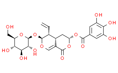 InChI=1S/C23H26O14/c1-2-9-10-5-15(35-20(31)8-3-12(25)16(27)13(26)4-8)36-21(32)11(10)7-33-22(9)37-23-19(30)18(29)17(28)14(6-24)34-23/h2-4,7,9-10,14-15,17-19,22-30H,1,5-6H2/t9-,10+,14-,15-,17-,18+,19-,22+,23+/m1/s1