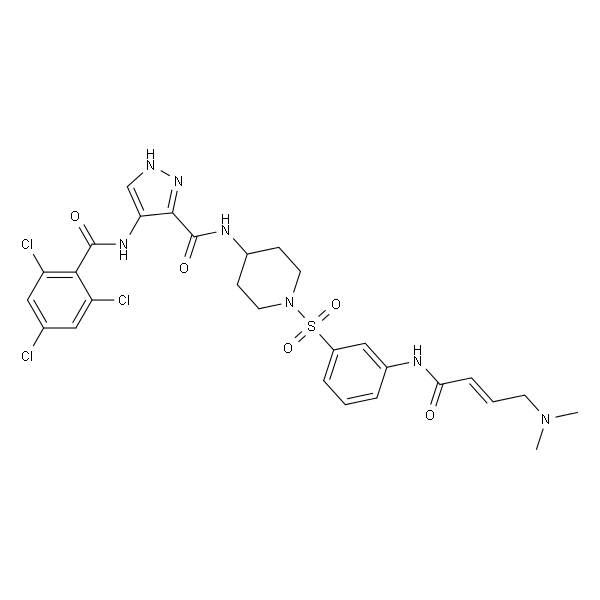 InChI=1S/C28H30Cl3N7O5S/c1-37(2)10-4-7-24(39)33-19-5-3-6-20(15-19)44(42,43)38-11-8-18(9-12-38)34-28(41)26-23(16-32-36-26)35-27(40)25-21(30)13-17(29)14-22(25)31/h3-7,13-16,18H,8-12H2,1-2H3,(H,32,36)(H,33,39)(H,34,41)(H,35,40)/b7-4+
