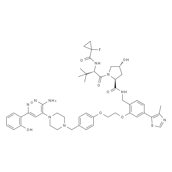 InChI=1S/C49H58FN9O7S/c1-30-42(67-29-53-30)32-11-12-33(26-52-45(62)39-24-34(60)28-59(39)46(63)43(48(2,3)4)54-47(64)49(50)15-16-49)41(23-32)66-22-21-65-35-13-9-31(10-14-35)27-57-17-19-58(20-18-57)38-25-37(55-56-44(38)51)36-7-5-6-8-40(36)61/h5-14,23,25,29,34,39,43,60-61H,15-22,24,26-28H2,1-4H3,(H2,51,56)(H,52,62)(H,54,64)/t34-,39+,43-/m1/s1