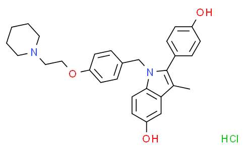 InChI=1S/C29H32N2O3.ClH/c1-21-27-19-25(33)11-14-28(27)31(29(21)23-7-9-24(32)10-8-23)20-22-5-12-26(13-6-22)34-18-17-30-15-3-2-4-16-30;/h5-14,19,32-33H,2-4,15-18,20H2,1H3;1H