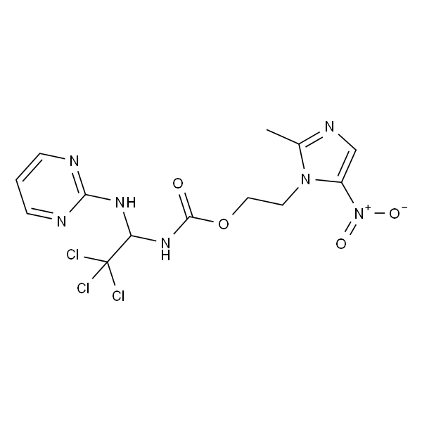 InChI=1S/C13H14Cl3N7O4/c1-8-19-7-9(23(25)26)22(8)5-6-27-12(24)21-10(13(14,15)16)20-11-17-3-2-4-18-11/h2-4,7,10H,5-6H2,1H3,(H,21,24)(H,17,18,20)