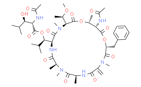 InChI=1S/C46H69N7O15/c1-22(2)37(56)34(49-30(11)55)45(63)68-38(23(3)4)35-43(61)53(14)36(28(9)65-15)46(64)66-27(8)33(48-29(10)54)44(62)67-32(21-31-19-17-16-18-20-31)42(60)52(13)25(6)39(57)47-24(5)41(59)51(12)26(7)40(58)50-35/h16-20,22-24,26-28,32-38,56H,6,21H2,1-5,7-15H3,(H,47,57)(H,48,54)(H,49,55)(H,50,58)/t24-,26-,27+,28+,32+,33-,34-,35-,36-,37+,38+/m0/s1
