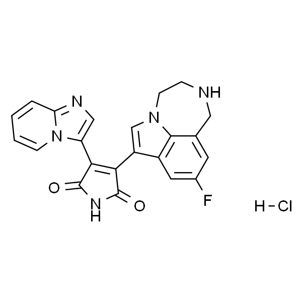 InChI=1S/C22H16FN5O2.ClH/c23-13-7-12-9-24-4-6-27-11-15(14(8-13)20(12)27)18-19(22(30)26-21(18)29)16-10-25-17-3-1-2-5-28(16)17;/h1-3,5,7-8,10-11,24H,4,6,9H2,(H,26,29,30);1H