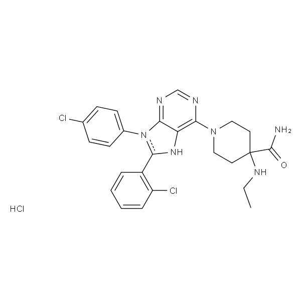 InChI=1S/C25H25Cl2N7O.ClH/c1-2-31-25(24(28)35)11-13-33(14-12-25)22-20-23(30-15-29-22)34(17-9-7-16(26)8-10-17)21(32-20)18-5-3-4-6-19(18)27;/h3-10,15,31H,2,11-14H2,1H3,(H2,28,35);1H