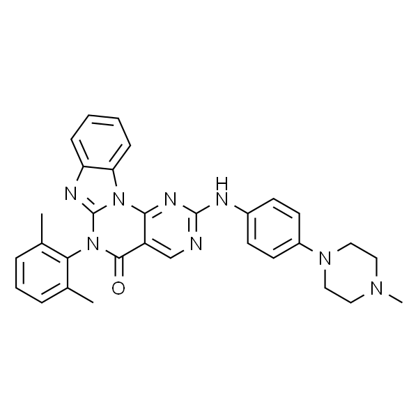 Tags:847950-09-8,6-(2,6-二甲基苯基)-2-[[4-(4-甲基-1-哌嗪基)苯基]氨基]-嘧啶并[5',4':5,6]嘧啶并[1,2-A]苯并咪唑-5(6H)-酮,cas号:847950-09-8,cas:847950-09-8