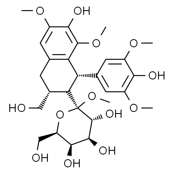 InChI=1S/C28H38O13/c1-36-16-7-13(8-17(37-2)22(16)31)20-15(11-40-28-26(35)25(34)23(32)19(10-30)41-28)14(9-29)5-12-6-18(38-3)24(33)27(39-4)21(12)20/h6-8,14-15,19-20,23,25-26,28-35H,5,9-11H2,1-4H3/t14-,15-,19+,20+,23+,25-,26+,28+/m0/s1